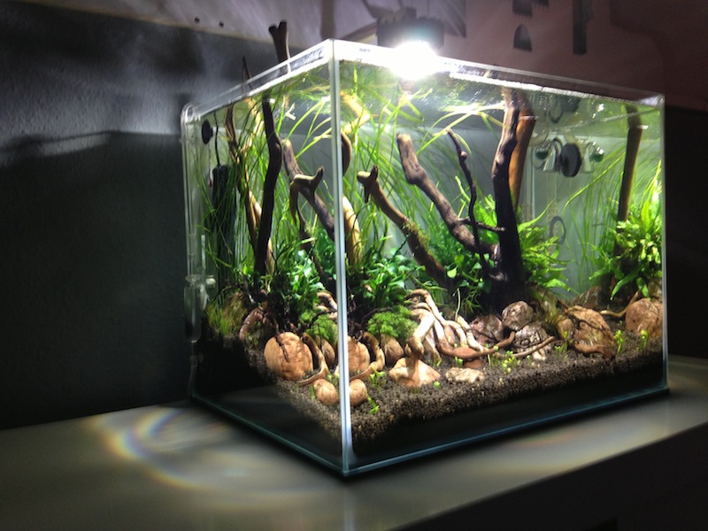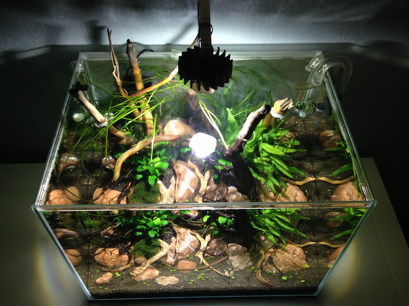 Pflanzen: Marsilea hirsuta, Blyxa japonica, Anubias ( Speerblatt ) barteri var. nana "Petite", Bolbitis heteroclita "difformis", Microsorum pteropus 'Narrow short', Microsorum pteropus 'Needle Leaf short', Riccardia sp., Vallisneria nana, Vesicularia "Christmas Moss", Hymenasplenium obscurum