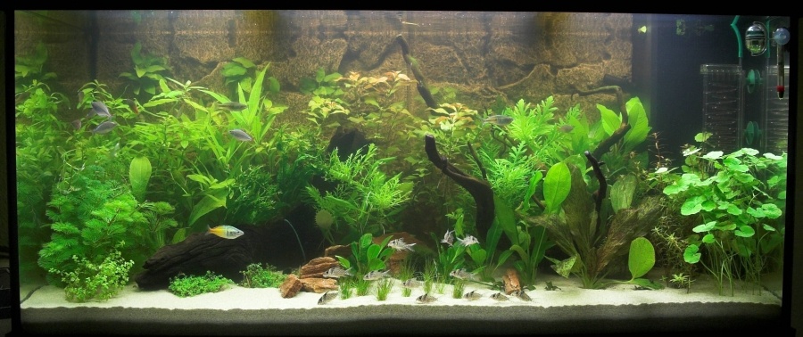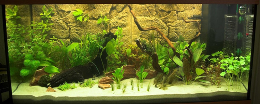 Es wächst alles ganz gut. Als Besatz habe ich Regenbogenfische und Panzerwelse. Mir fehlt noch ein Fisch für die Oberfläche. Da habe ich noch keine Idee.