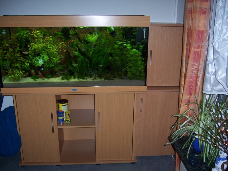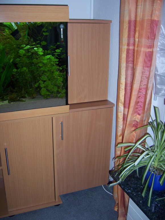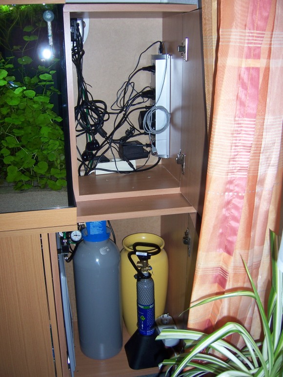 Es ging etwas weiter, wenn auch neben dem AQ. Da meine 6kg CO2-Flasche kam, musste die mit 60cm Höhe verstaut werden. Auch braucht man doch einiges an Platz. Da rechts neben dem AQ noch Platz war, hab ich einen Schrank eingebaut. Unten für CO2 und oben die Technik. Hier kommt auch noch meine Düngepumpe hin.