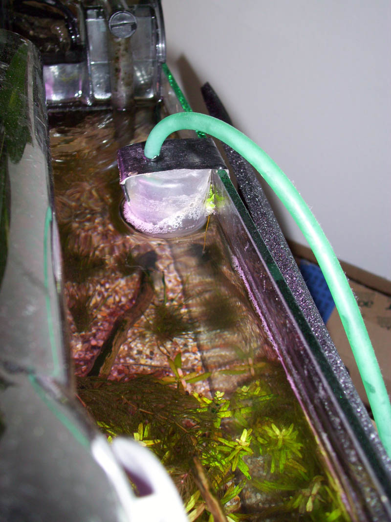Die Waschflasche mit dem Co2 Einleitungsschlauch (der lange) und dem weiterführenden Schlauch, der das gewaschene Co2 ins Becken leitet (der kurze) und beide Flaschen unterm Schreibtisch ;)