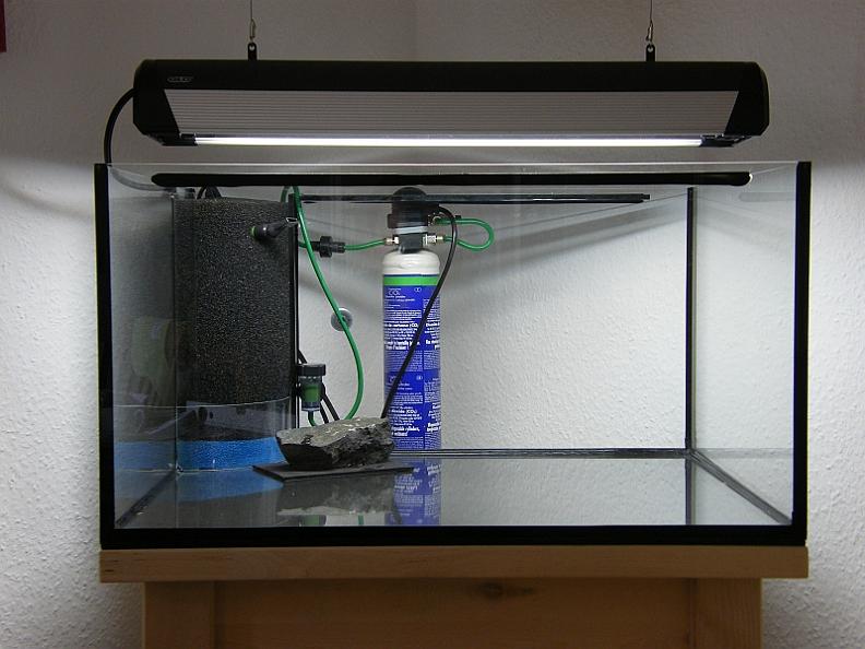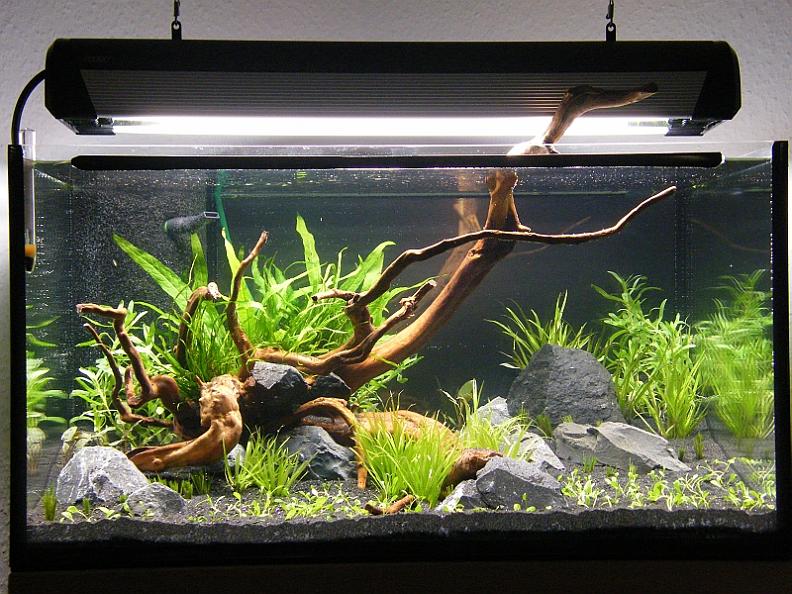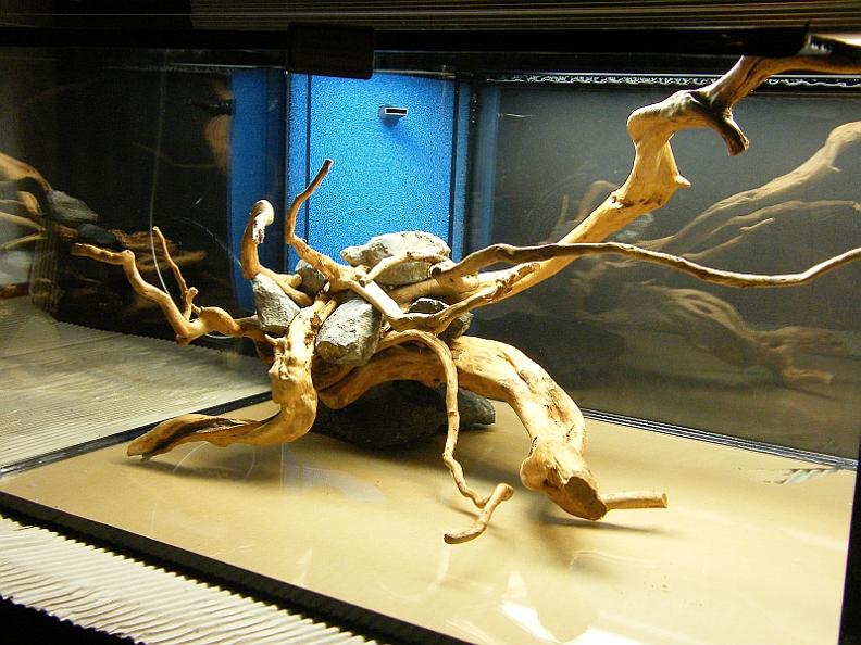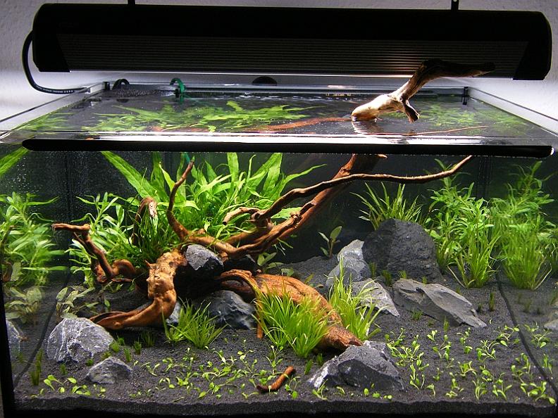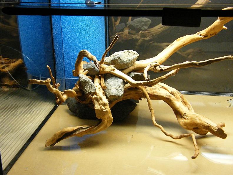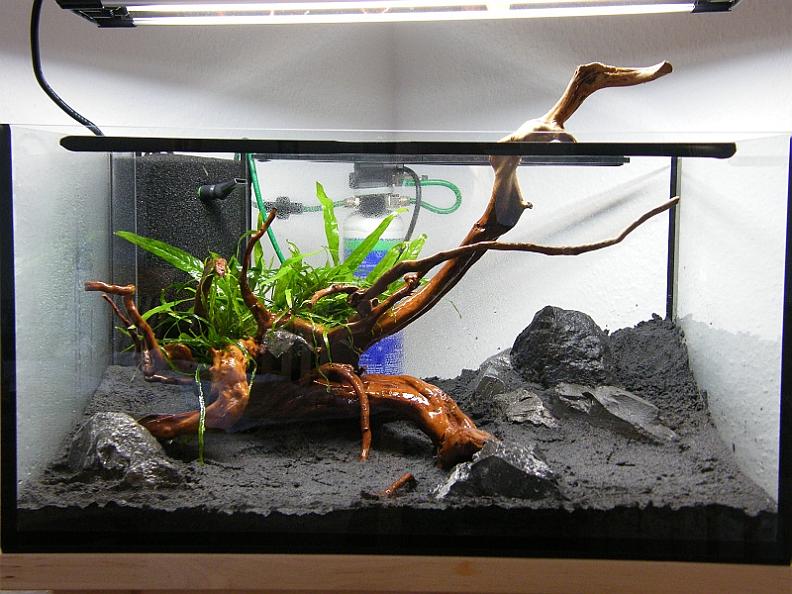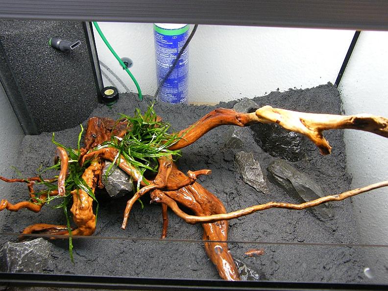 habe mal wieder ein neues Becken geplant! Die Maße sind LxBxH 60x48x32 cm. Das Becken kam gestern vom AQ Bauer heute habe ich schon mal was an den Hardscapes gebastelt. Zentrales Element wird eine große rote Moorkienwurzel sein, dazu kommt als Boden schwarzer Sand mit 0.2-0.5 mm Körnung und einiges an schwarz grauem Granit.Bebeuchtung wird eine 2x24 Watt T5 Hängeleuchte mit Lichtfarben 840 und 865. Gefiltert wird über einen Eck HMF der dann von einen dicken Busch aus Rotalla Rotundifolia und Heteranthera Zosterifolia verdeckt wird, auf die Wurzel soll Narrow Leaf und Moos. Rein sollen auch noch Blyxa, Moose beim Rest der Pflanzen suche ich noch! Der Vordergrund und die rechte Seite sollen frei von Pflanzen bleiben eventuell auf rechts kommt noch Moos auf die Steine. Ich denke mal der Rest entsteht bein einrichten. Die Wurzel habe ich schon mal platziert wie ich es mir vorgestellt habe und auch schon ein paar Steine eingearbeitet.