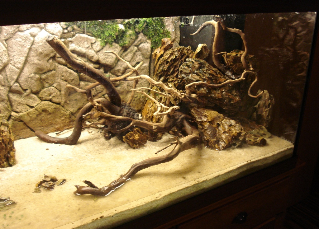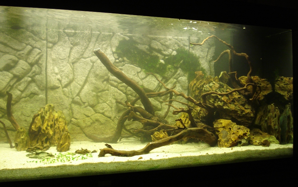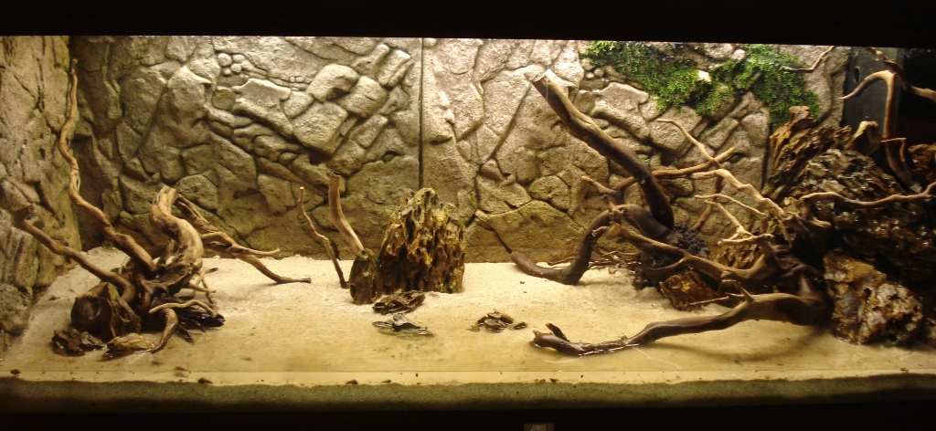 Muß Tobi Recht geben, mit dem einsamen kleinen Stein in der Mitte ziemlich genau vor der Naht lenkst du schon ein wenig die Aufmerksamkeit dorthin, ich würde auch versuchen, den in das Wurzelensemble links zu integrieren und vielleicht so ein Tal in der Mitte entstehen zu lassen. Hast du die Möglickeit vielleicht von der linken den einen Ast der so nach hinten Richtung Rückwand ragt mehr in die Mitte ragen zu lassen, da würde sich dann prima ein wenig Moos drauf machen.