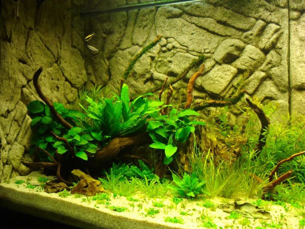 Also gestenrn Abend habe in nun noch die neue Anubias ( Speerblatt ) und den Javafarn so gesetzt, wie Tutti es mir empfohlen hat. Sieht auch ganz gut aus! So jetzt sollte es das erst mal gewesen sein :wink2: Bin mal gespannt wie alles wächst. Die Blyxa verliert leider fast alle äußeren Blätter, aber dafür kommen jetzt extrem viele neue schön rötlich gefärbte Blätter nach :happy: Ist das normal, das die vorher so zerfällt?