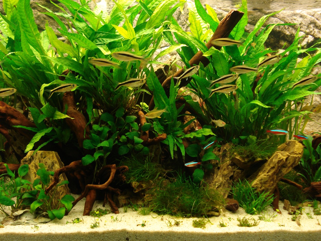 nein ich beleuchte noch keine volle 12 Stunden. Ich beleuchte insgesamt neun Stunden. Davon fünf Stunden mit 2x54 Watt und vier Stunden mit 4x54 Watt. Die 4x54 Watt werden jetzt wöchentlich um eine Stunde erhöht und dann letztendlich auf 10 oder 11 Stunden erhöht. Und das mit dem Javafarn bekomme ich schon hin :wink2: Ansonsten bekommt er relemäßig die Schere zu spüren :lol: