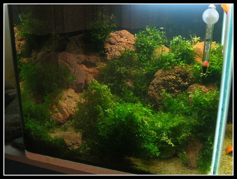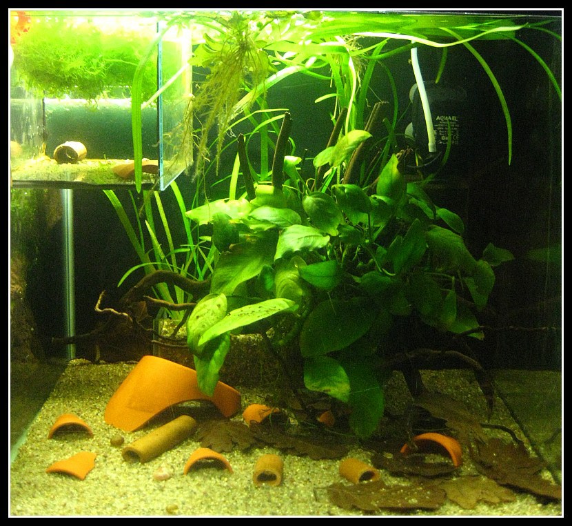 im 54er habe ich ja einen HMF in der Negativ-Variante verbaut, sprich die Filtermatte geht von vorne links nach hinten rechts... somit habe ich einen negativen Halbkreis in der hinteren linken Ecke. Die Matte ist eine normale schwarze Matte mit ppi20 und 3cm stärke. In die Matte habe ich dann einfach mit einem Cuttermesser 1cm tiefe Schlitze rein gemacht. Hier kann man dann die Anubien einklemmen. Alternativ kann man auch an der Stelle wo die Anubie hin soll mit einer Schere einen kleinen Schnitt machen. Und hast du schon deinen Bastelnachmittag gestartet?!