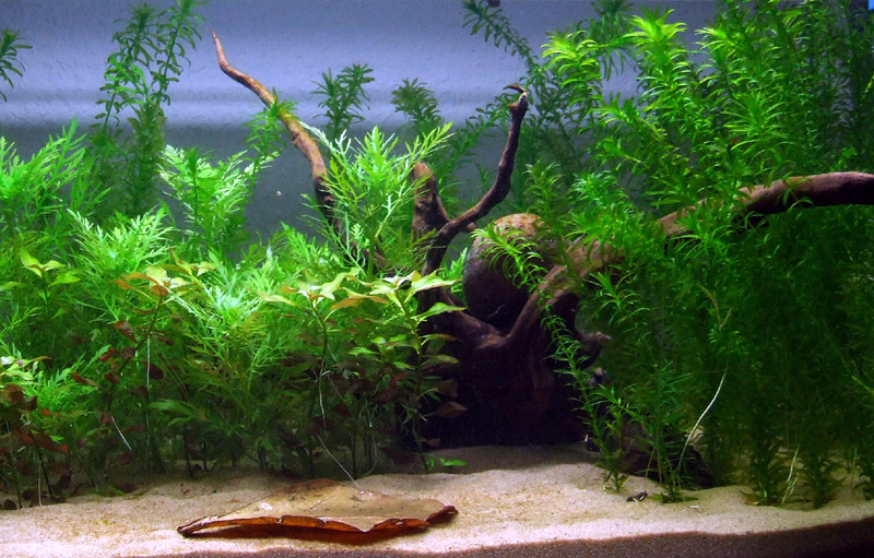 Die Bepflanzung soll später noch geändert werden. Auf die Wurzel will ich noch Moos und Farne aufbinden. Von der Wurzel aus soll später eine Art niedrigwachsende Wiese angelegt werden. Im Moment würde die Wurzel aufschwimmen, daher der Stein als Gewicht. Ich habe sie zwar schon einige Tage gewässert, reichte aber noch nicht. Steine sollen auch noch reinkommen, so als Akzente, mal sehen und noch oder eine kleinere Wurzel auf der anderen Seite.