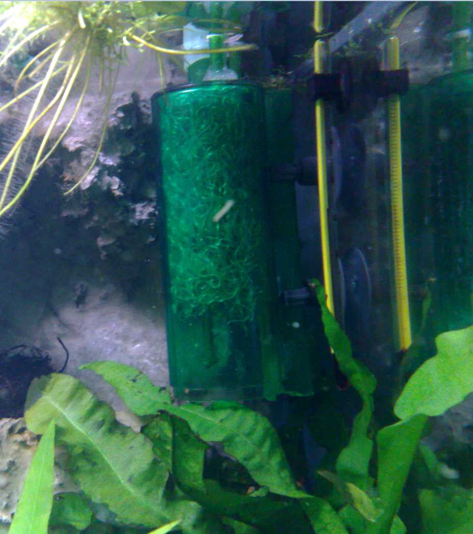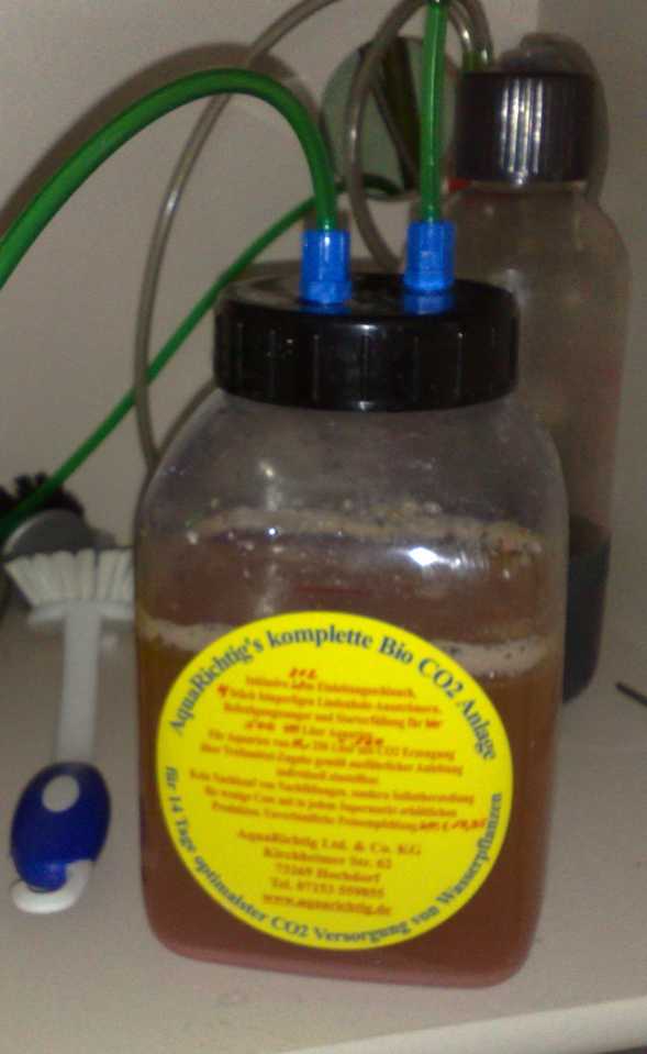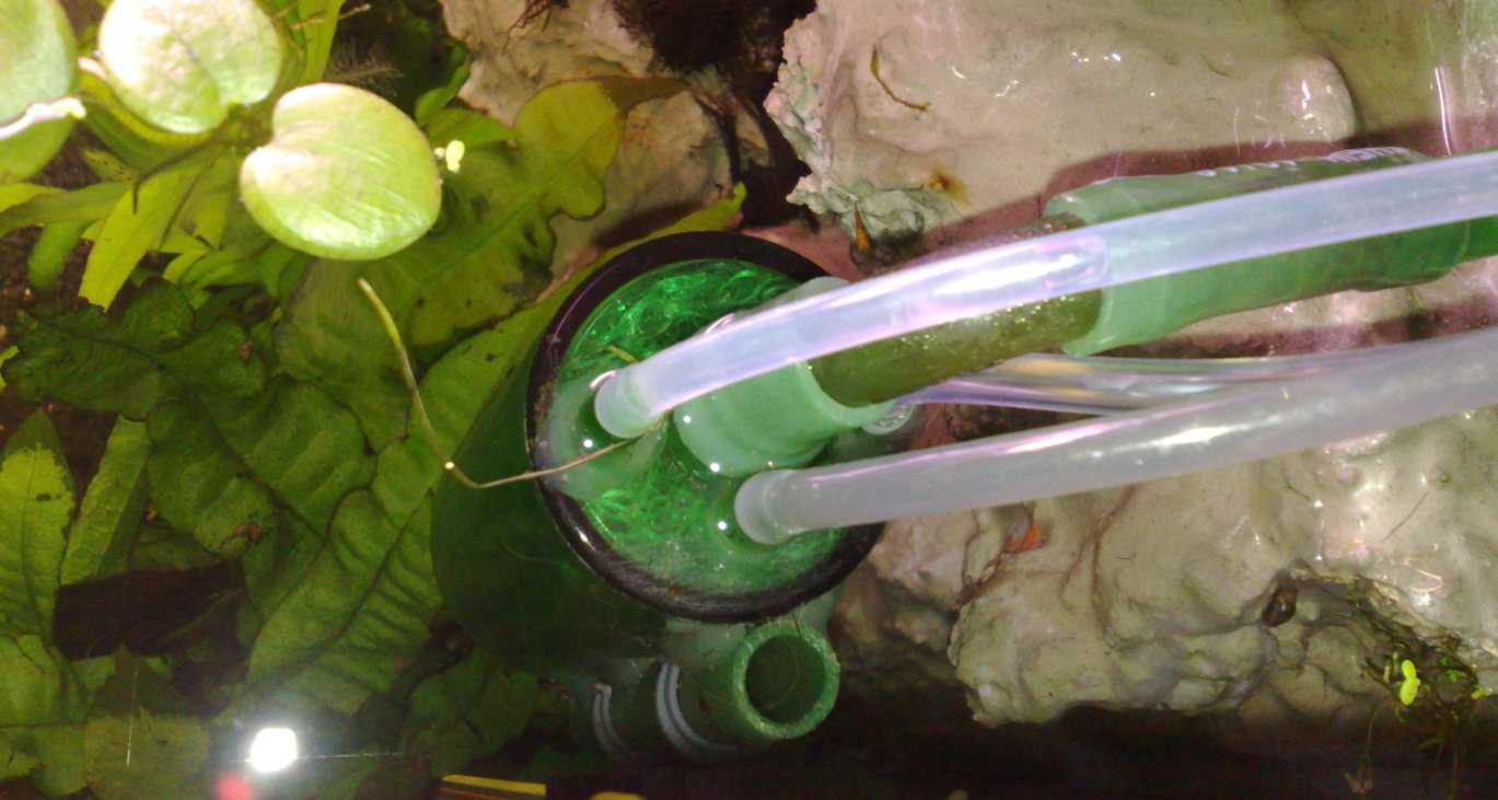 Aber das stimmt er funktioniert ausgezeichnet und ist deutlich effektiver wie jeder teure Flipper – da habe ich noch einige zu liegen. Das Prinzip ist recht einfach in der Skizze zu Erkennen. Ursprünglich hatte ich sogar 2 Hefeflaschen angeschlossen und das CO2 beider Flaschen wurde völlig gelöst. Für die ca. 300 L meines 375 Beckens ist diese Konstellation genau richtig um kontinuierlich 20-30mg CO2 laut Denerle Ei vorzuhalten. Ein Blasenzählererübrigt sich da man sehr schön sieht wie die Blasen ins Grüne Filtermaterial strömen.