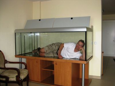 Die Unterschrankskonstruktion hätte auch einen externen Filter unter dem Becken hergegeben, aber ich wollte den Wasserkreislauf alleine wegen der Verdunstung schon im Becken halten und keine Löcher in das Becken bohren. Sowas hat mir schon immer Angst gemacht. :shock2: Häufig gibt das dann auch laute Plätschergeräusche im Wohnzimmer, und mehr als einmal habe ich Leute getroffen, die aus lauter Verzweiflung Löcher bis in die Keller gebohrt haben, um die Filteranlagen dann außer Hörweite zu installieren. So muss ich nur von links nach rechts pumpen, fertig.
