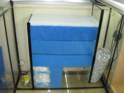 Zuerst habe ich brav den Filter befüllt. Auch dazu hatte ich viel gelesen. Aus früheren Zeiten hatte ich Erfahrung mit Biofiltern, die im Vergleich zu den teuren käuflichen Filtern um ein Vielfaches wartungsärmer und dazu noch effektiver sind. Ideal für faule Leute wie mich. :lol2: Aus Sicherheitsgründen und um das ganze System so simpel wie möglich zu halten, habe ich mich für einen Innenfilter entschieden und 20cm links vom Becken abtrennen lassen, also 10% oder 110 der 1120 Liter.