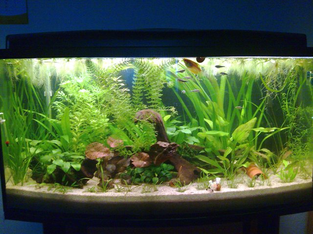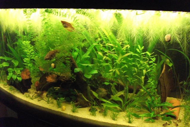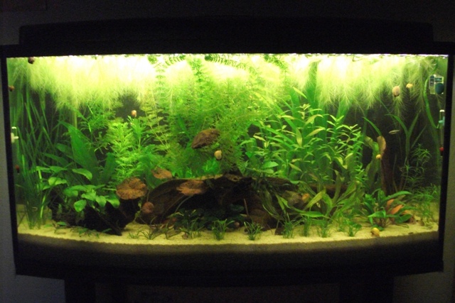 Die Beleuchtung besteht aus zwei T8 30 W Röhren, eine für das Pflanzenwachstum und eine, die die Farbpracht der Fische hervorhebt.