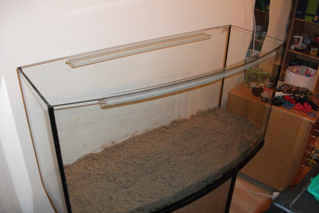 Insgesamt sind 37,5 kg Sand im Becken, die unteren Schichten sind neu, die oberste vom alten Becken.