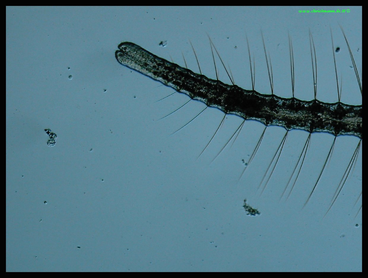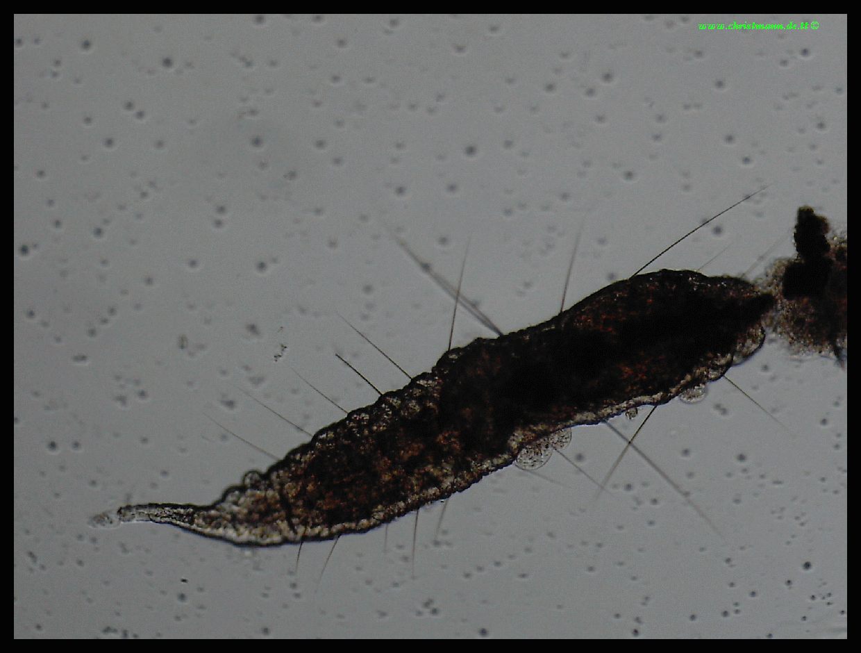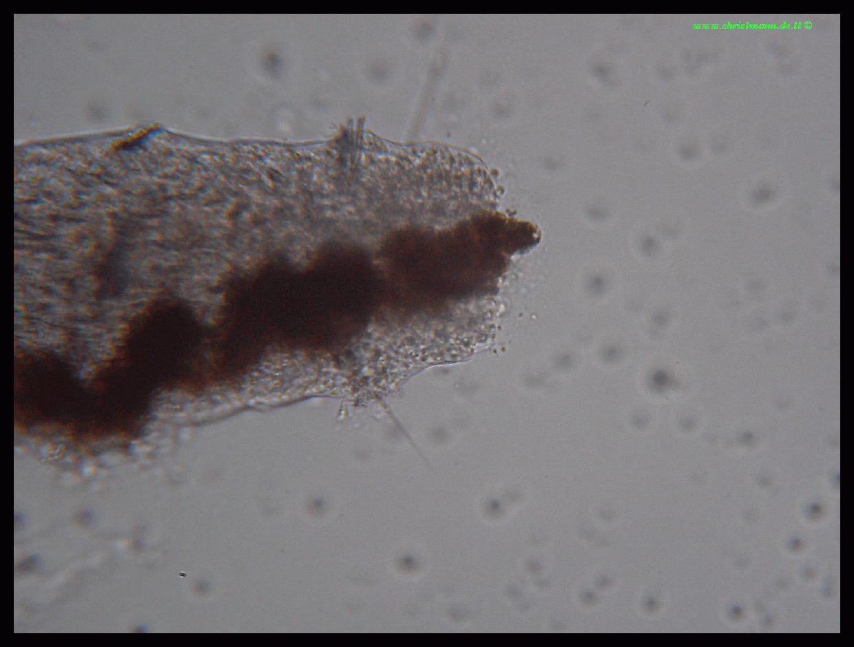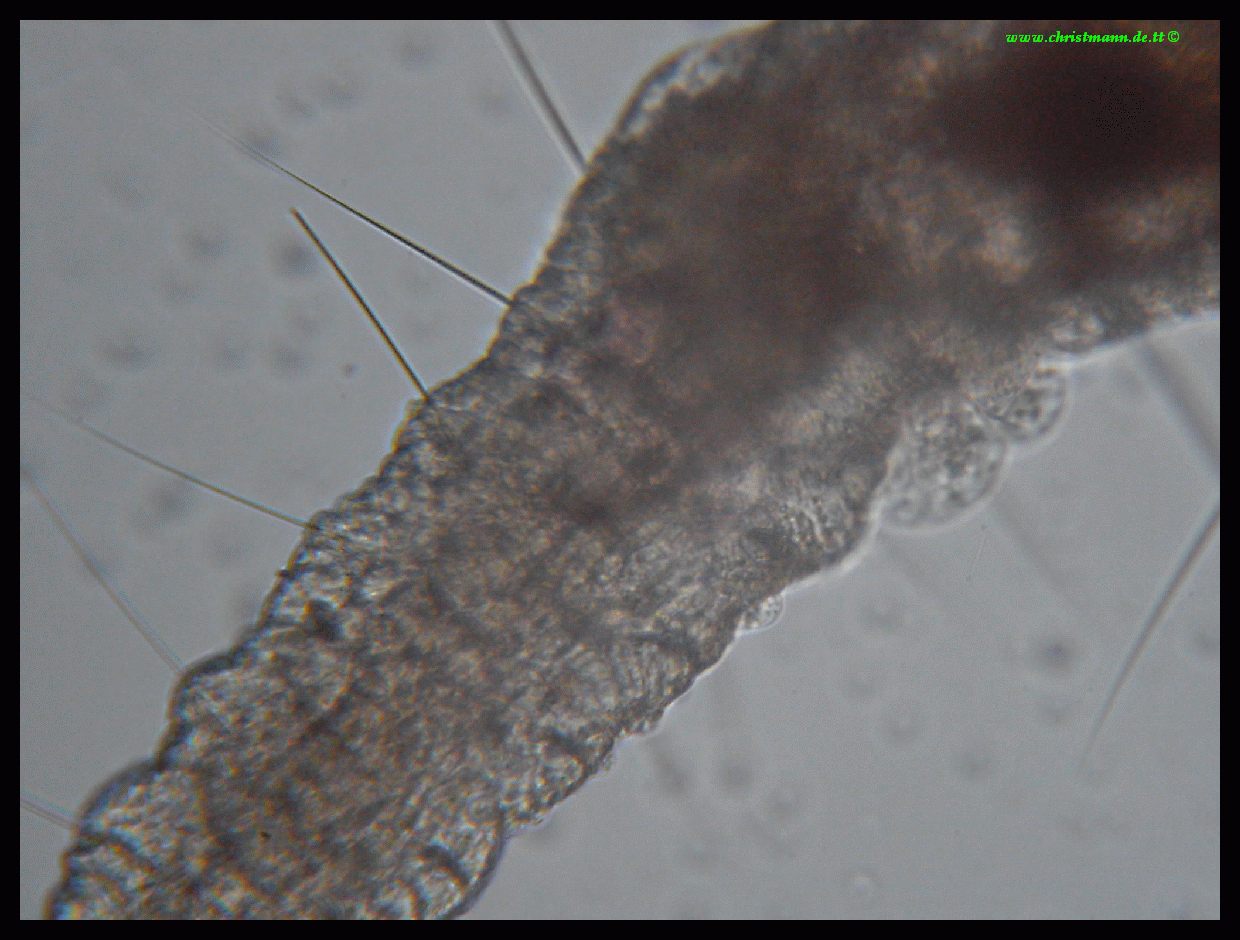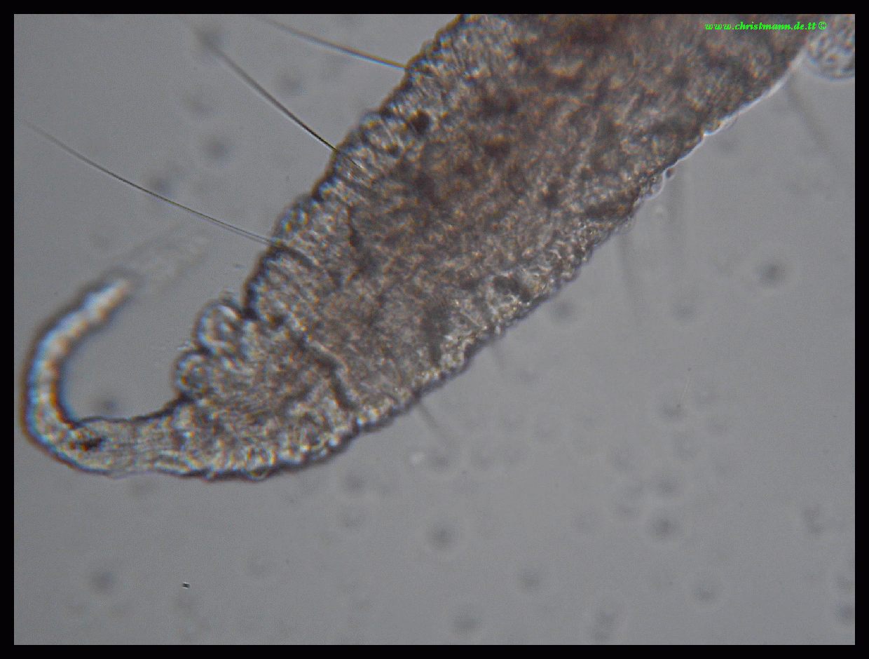 Erstens hab ich zum ersten mal im Leben Hydra und zweitens einen freischwimmenden, schnellschlängelnden, rötlichen 3-4mm Wurm, der mit dem blosen Auge einem winzigen peitschenden Tubifex ähnelt, aber unter dem Mikroskop dann doch viel eher einer Rattenschwanzlarve der Mistbiene ähnelt.