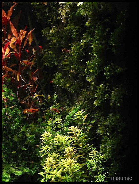An der rechten Seite habe ich vor drei Wochen eine schwarze 3cm starke Filtermatte angebracht und Süßwassertang darin eingeklemmt, da mich die Glasfront an der Seite immer gestört hat.