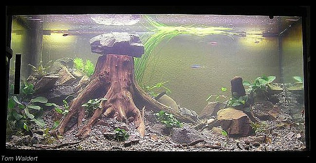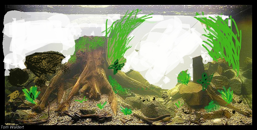 Mein aller erstes Becken war ein 200 Liter Becken mit Standardbeleuchtung von 60 Watt und einem Fluval Aussenfilter. Das ding war voll mit Pflanzen und komplett bunt in meinem alten Zimmer.Nach 2 Monaten wars aber damit das Becken konnte nicht mehr so mit Pflanzenwuchs überzeugen...so ziemlich alles eingegangen.War auch klar es wurde nicht gedüngt und schwaches Licht.Nach dem Umzug in mein Kellerzimmer hab ichs dann nochmal neu eingerichtet aber das war alles nimmer so recht.In den letzten Monaten war es einfach komplett schwarzes Wasser und es war bis oben hin voll mit Wurzeln denn diese müssen ja auch irgendwo wässern.Paar Fische sind noch drin rumgeschwommen aber das war mir alles egal.