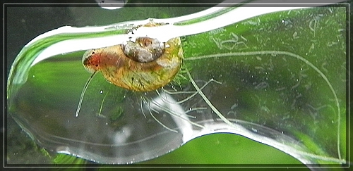 heute morgen habe ich einen algenfaden zwischen meinen fingern...und war erschrocken als da eine schnecke dran hing (sie ist ca. 5 mm groß).