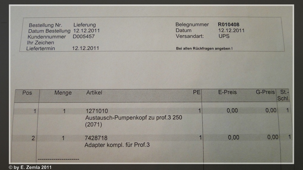 Dieser veranlasste eine Abholung des Pumpenkopfs bei mir zu Hause. Am Freitag, den 09.12.2011 wurde der Kopf bei mir von DHL abgeholt.