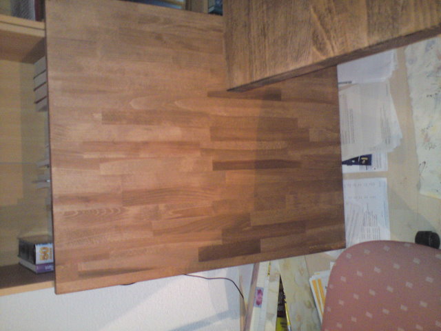Die Verblendung aus Buche mußte ich vorab beizen, weil wir im WZ Nußbaum haben und es irgendwie passen sollte. Also 2x beizen mit Clou Nußbaum hell, dazwischen NICHT schleifen, dann 2x Clou Schnellschliffgrund (Achtung: Nitrodämpfe sind ungesund, dafür trocknet die Suppe binnen 30 Minuten schleiffertig), dazwischen mit 180er oder 240er schleifen, staubfrei machen, neu streichen etc., danach 1x Acryllack klar - fertig ist die wischfeste Oberfläche. wer Zeit hat trägt den Klarlack mit zwischenschliff (mind. 240er) 2x auf. Buche rötlich kommt damit gut als Nußbaum hell (dunkelt mit den Jahren etwas nach).