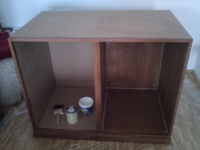 Jetzt kam, mit Folie zwischen Kiste und WZ-Parkettboden, noch ein schützender Acryllackanstrich Außen und Innen 81x genügt, 2x ist besser, grundierung etc. unnötig). Die fertig lackierten Seitenteile wurden positioniert und von den Innenseiten der Korpusaußenwände mit 4 Spax fixiert, die Deckenverblendung darauf dito. Hält tadellos und sieht, wie ich finde, ordentlich aus. Wer Zeit und Lust hat, könnte die Schnittflächen der Deckplatte rundum mit einer profilgefrästen Zierleiste, entsprechend vorbehandelt, aufkleben (Montage kleber oder 2K-Epoxy).