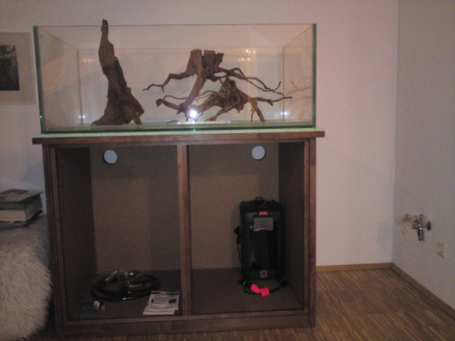 Das Becken kam am Folgeabend. Hab es auf drei 3mm Schichten Trittschalldämmplatten passender Größe gestellt (das Übermaß schnitt ich mit einem Teppichmesser bei darauf stehendem Becken rundum bündig ab. So paßt später (kommen auch noch) die Kiesblende aus 10mm starker Buchenleiste und der Beleuchtungsaufsatz aufs Becken. Dazu später mehr, wenn's soweit ist.
