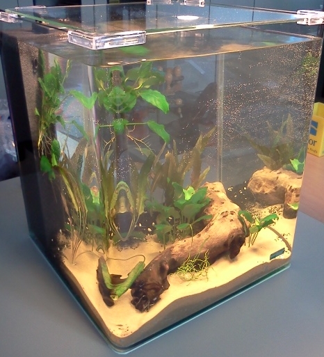 Als Filter dient ein schwarzer feiner Schaumstoffblock, den ich innen mit einem Rohr versehen habe, dass auf ganzer Länge vierreihig mit Löchern durchbohrt wurde. Die oben im Block eingesetzte Pumpe ist die kleinste von e-heim 5W. Die Leistung habe ich weitmöglichst reduziert.