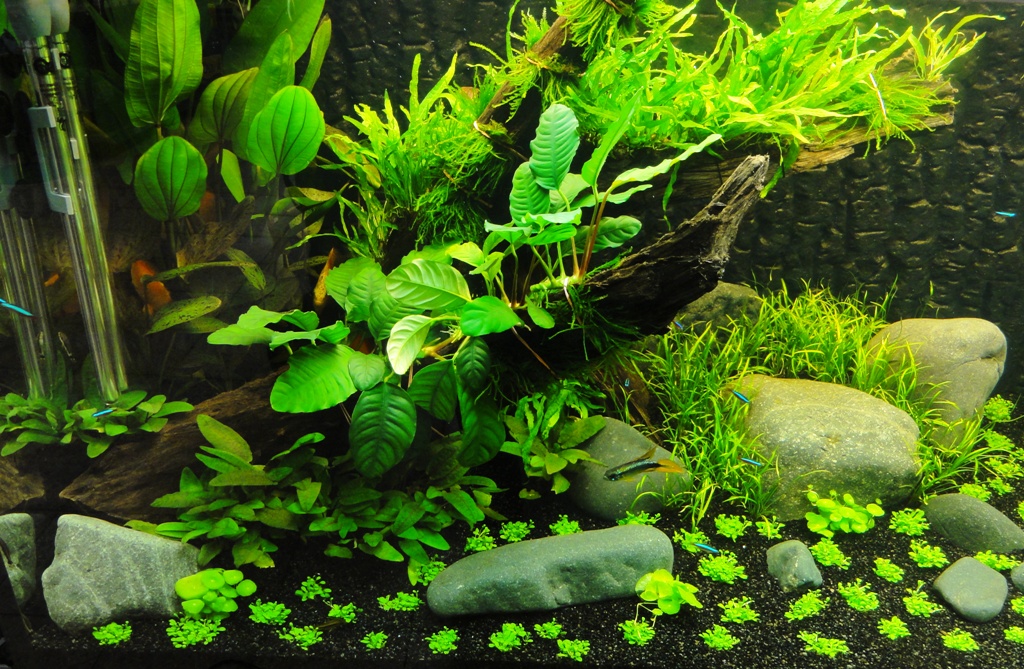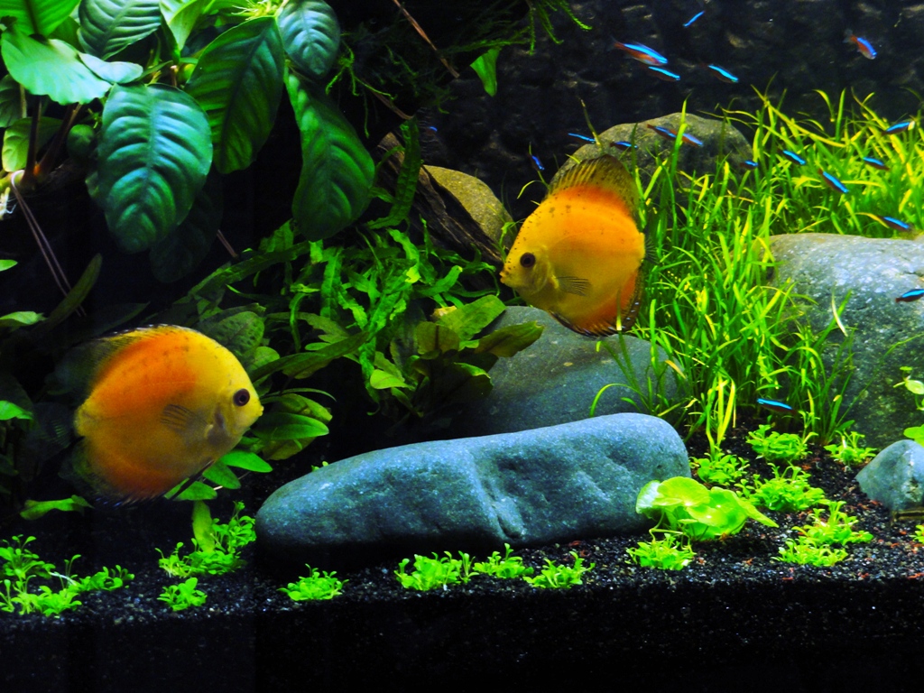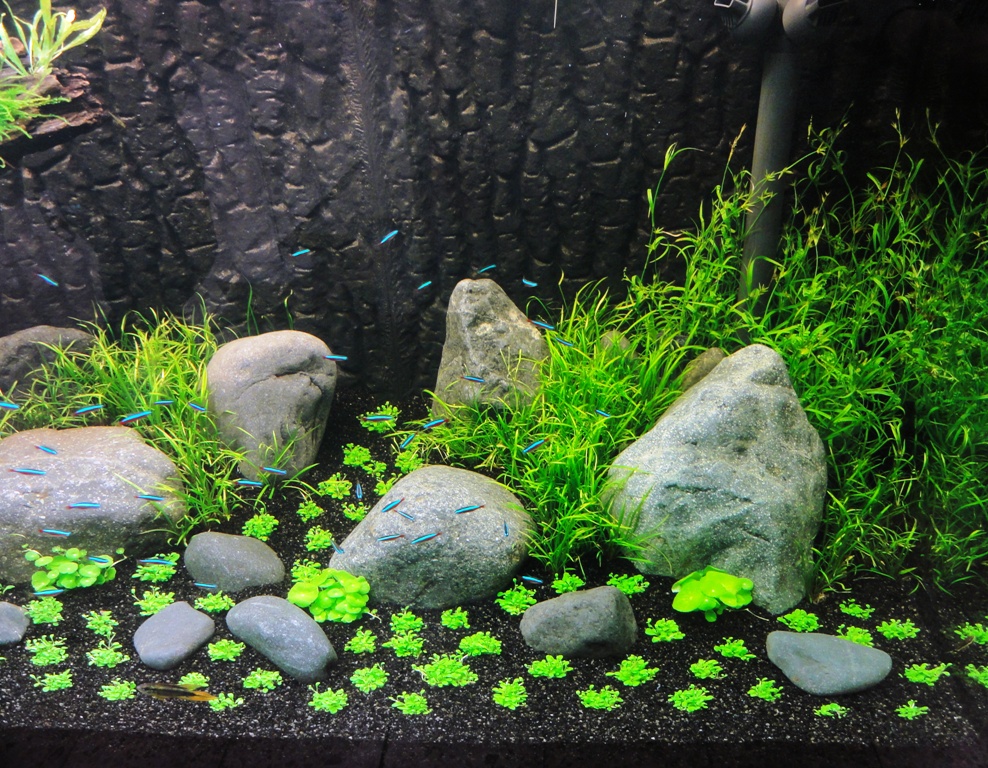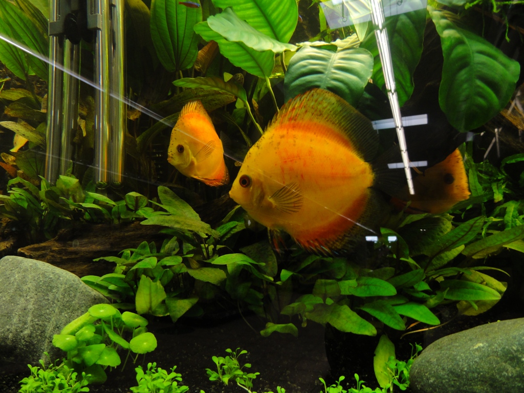 erst mal danke für die Feedbacks :wink2: Ich wollte euch kurz noch mal Bilder von gestern nachreichen. Jetzt auch mit klarem, nicht gelben Wasser :lol2: Also der gesamte Besatz ist wohl auf und es hat bisher keinen einzigen Ausfall gegeben. Leider sind die Diskusfische auf den Bildern so gut wie nicht zu sehen, da ich vorher einen Wasserwechsel gemacht habe und sie noch recht scheu sind. Aber Jörg, wie du jetzt sehen kannst sind genügend Versteckmöglichkeiten vorhanden, denn immerhin besteht der Diskusbesatz aus sieben Marlboro Red :wink2: