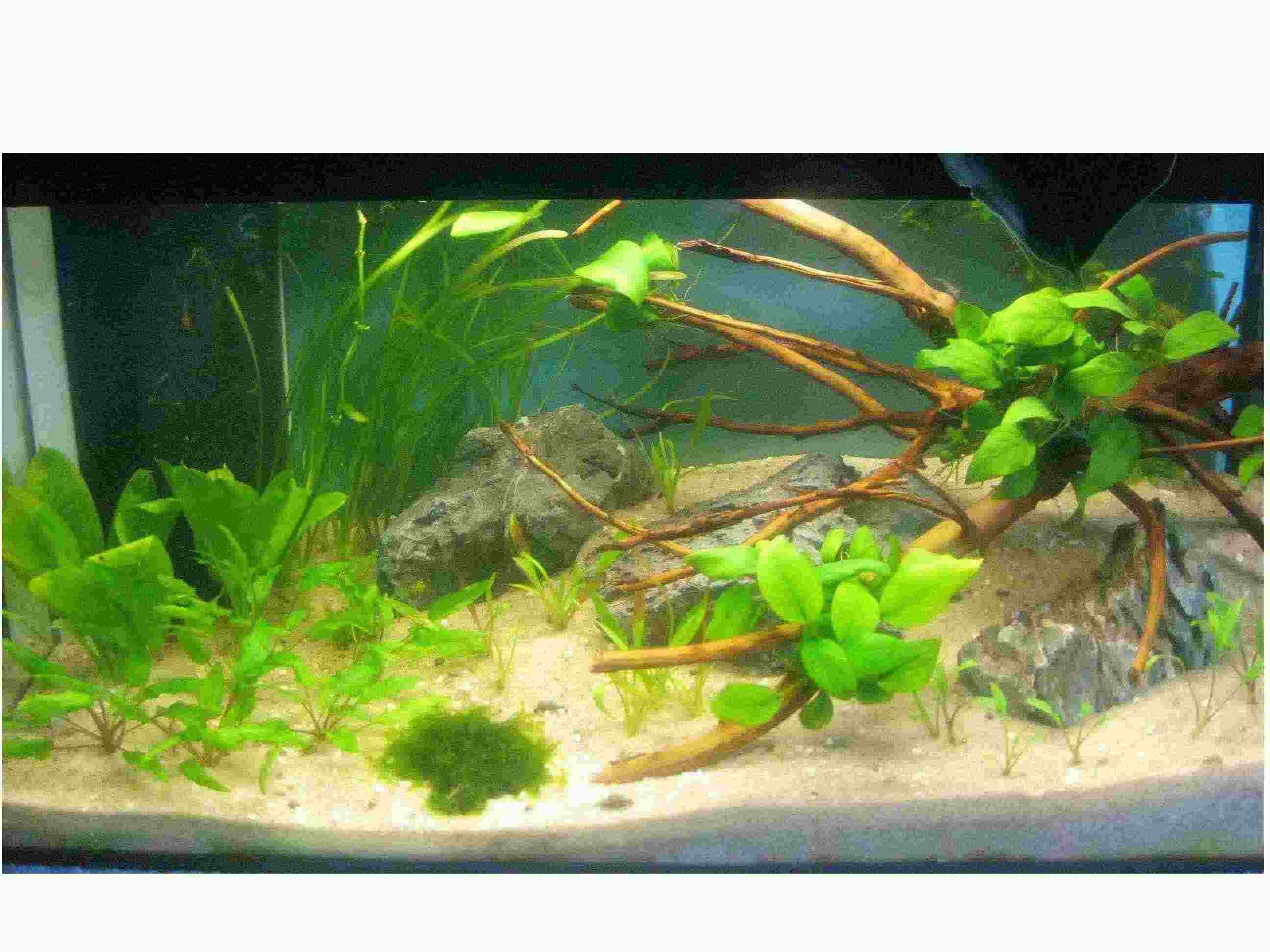 Gedüngt wird wöchentlich mit Easy Life ProFito, im Boden sind JBL ProFlora Düngekugeln und täglich gibts einen Schwupps kohlensäurehaltiges Mineralwasser.Das Becken läuft seit über einem Jahr, ich habe nur frisch gegärtnert, ein paar Pflanzen umgesetzt und die Wurzel neu reingesetzt. Hinter die Wurzel kommen noch Kopfstecklinge von brasilianischem Wassernabel und auf die Wurzel Javamoos.