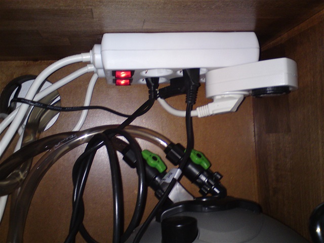 Die ersten 3 zeigen den Blick in die linke Hälfte des Unterschranks. Die darin verstaute Technik ist noch nicht endgültig, da der externe Regelheizer noch fehlt (in den Filterkreislauf einzubauen) und der Filter auf einem provisorischen Podest steht, um die druckmindernden Strecken geringstmöglich zu halten.