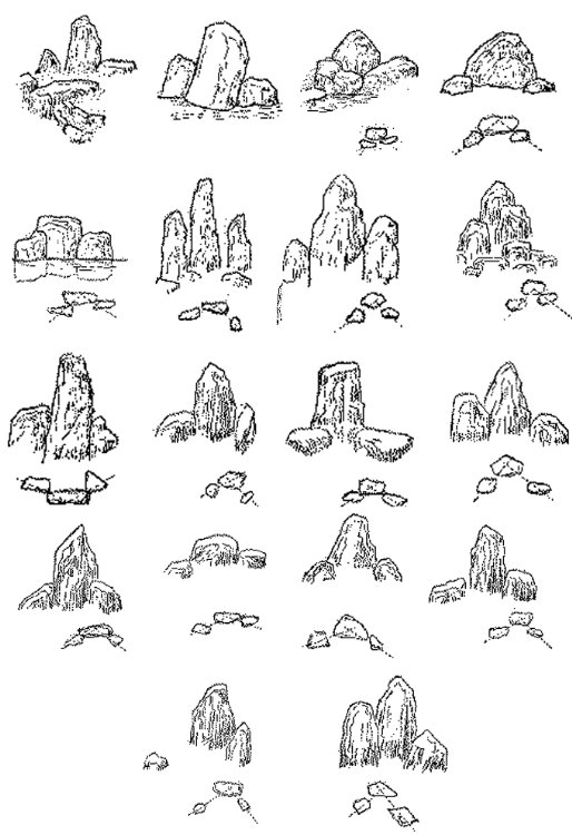 Wesentliche Gestaltungselemente sind Größe, Form, Position und Farbe der Steine sowie die Abstimmung ihrer Umgebung auf die Gruppe resp. die Einbettung derselben ins Gesamtbild.