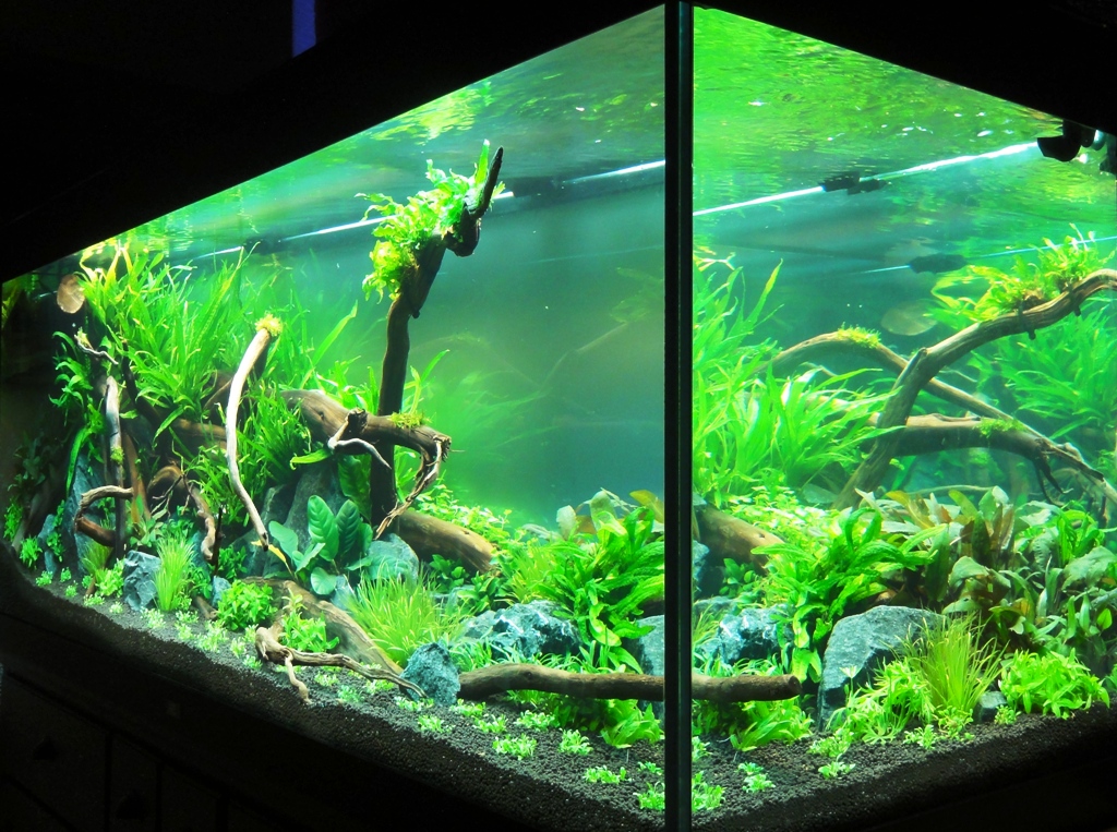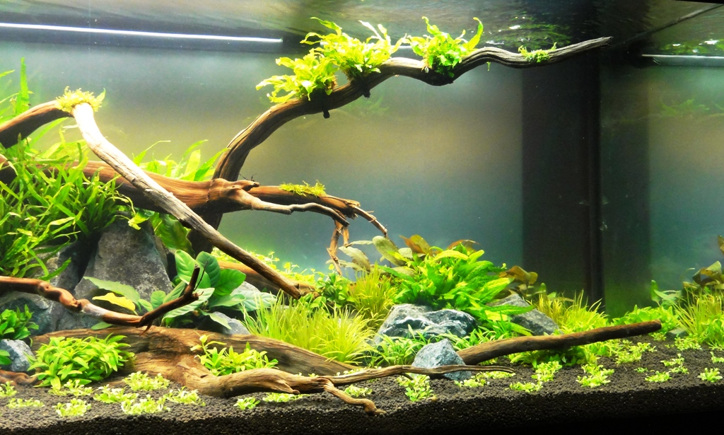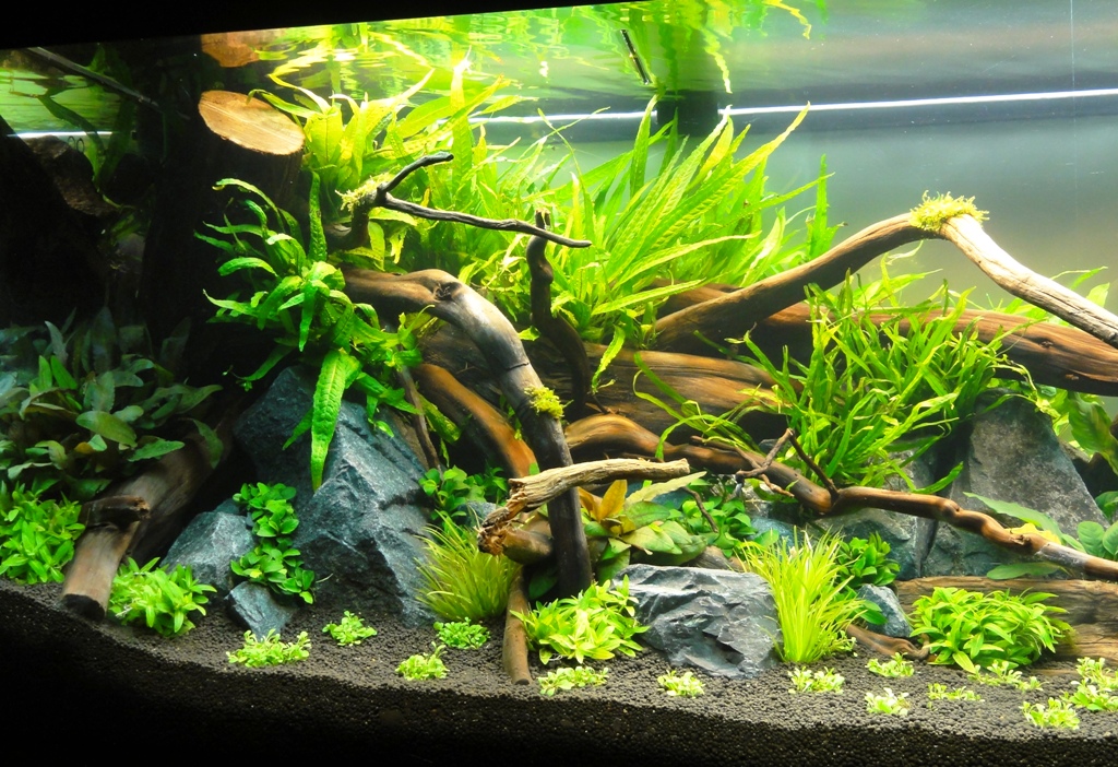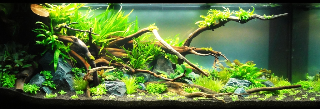 Übrigens,im großen Buch der Naturaquarien von Amano auf S. 68-69 ist ein ähnliches Layout nur Seitenverkehrt abgebildet. Die Bepflanzung ist hier aber stark abweichend von Deiner. Aber Holz und Steine dominieren auch hier.