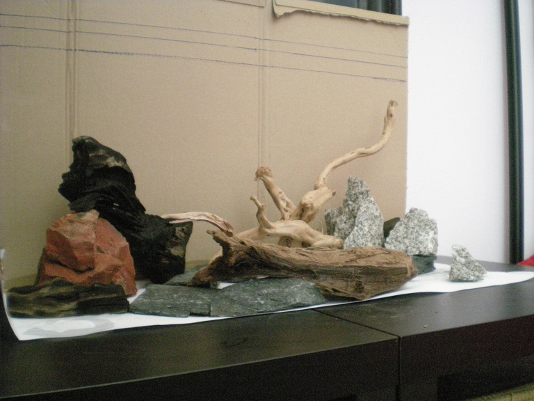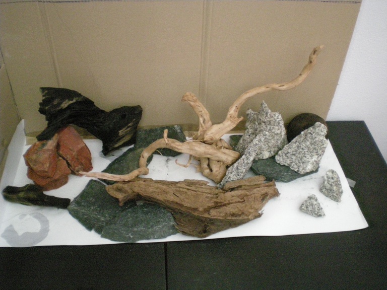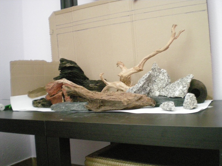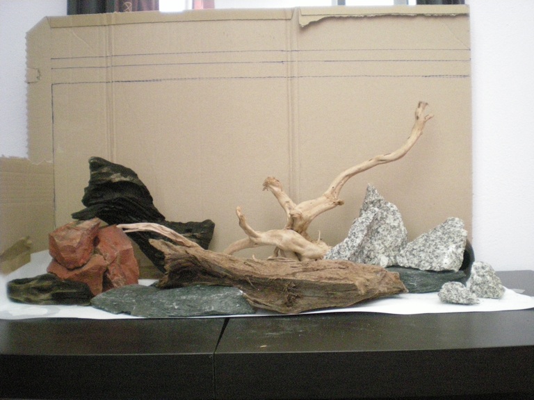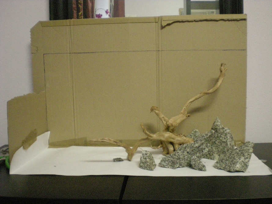 Ich hab auch mal ein Foto von meinem Pappkarton-Versuchsaquarium gemacht. Die Line oben zeigt wie viel Platz noch da ist bis zur Wasseroberfläche abzüglich Sand. Alles, was ich derzeit an Material zur Verfügung hab, wurde mal wahllos radaufgepackt. Ein paar Dinge fehlen noch, sollten aber auch innerhalb einer Woche eintreffen. Meine Mutter hat nun doch zugestimmt, dass ich ihre Aquariumeinrichtung für 2-3 Tage für Layoutversuchszwecke aus dem Becken entfernen darf. Die Pflanzen bleiben solange drin und die neuen werden zwischengelagert, bis der Umbau im laufenden Becken stattfindet. Sie hat schon angekündigt, an diesem Tag dann nicht zuhause zu sein, sodass ich in aller Ruhe herumräumen kann. Schon erstaunlich, dass bei solchen Aktionen immer alle abhauen :morgähn_m: