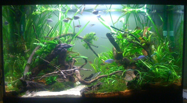 Den Bodengrund hab ich komplett und diesmal gegen durch und durch einfärbigen Kies getauscht. Meine Mama hat sich die Farbe ausgesucht. Die Milchglasfolie wurde auch angebracht. Die zusätzlichen Äste und Wurzeln sind eine Auswahl aus den selbstgesammelten Beständen, die ich vorher ein paar Wochen gewässert hatte. Den Pflanzenbestand hab ich zu 80% erhalten und das Moos (Danke noch mal an JK2) eingebracht. Ansonsten sind keine neuen Planzen dazugekommen. Ich hoffe sehr, dass der das Moos noch die eine oder andere Lücke zwischen den Steinen schließt, auf denen ich es mit Haarnetzen befestigt hab. Jetzt heißt es für die Pflanzen erstmal nur noch wachsen, wachsen, wachsen.