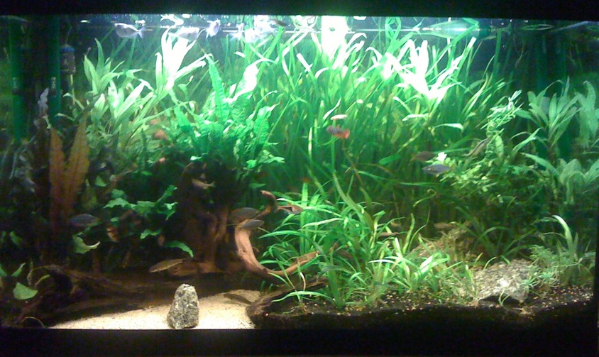 Vallisneria nana verhält sich ähnlich. Glossotigma elatinoides wächst nicht, wird aber auch nicht weniger - mal abwarten, wie es sich weiterentwickelt. Elocharis aciularis kam schon mit braunroten Spitzen bei mir an. Bilde mir ein, dass es wäschst und das Grüne im Verhältnis zum Rotbraun mehr wird. Echinodorus grisebachii schiebt kräftig neue Triebe, obwohl bei der Mutterpflanze auch vereinzelt gelbe Blätter zu sehen sind. Micranthemum micranthemoides ist dabei Wurzeln zu schlagen und wächst ganz schön in die Höhe. Hygrophilia Thai Stricta fängt nun auch ganz langsam an zu wachsen, wie auch Samolus Valerandi, Hygrophila corymbosa und noch ein paar Pflanzen aus dem Altbestand meiner Mama, von denen sie nicht mehr weiß wie sie heißen, welche ich aber nur schwer bestimmen kann, weil es mindestens noch 4-5 andere Arten gibt, die ihnen sehr ähnlich sehen. Der Javafarn ist auch noch immer schön grün und auch das Moos fängt langsam mit dem Wachsen an. Der einzige Stengel Hornkraut ist nach anfänglichen Schwierigkeiten nun auch brav gewachsen und wartet wie Hygrophila polysperma "rosanervig" und ganz besonders Limnophila heterophylla auf einen Rückschnitt. Von Algen bislang keine Spur.