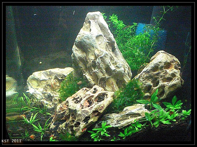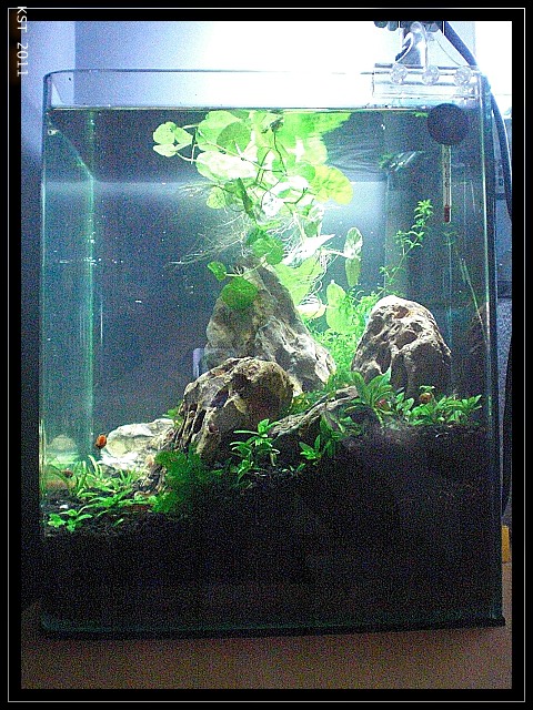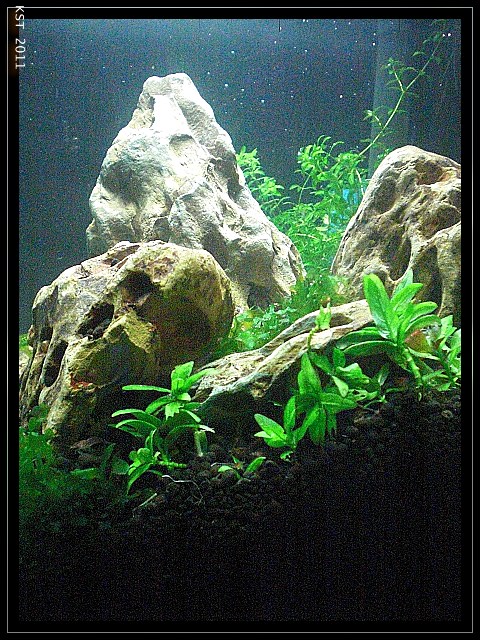 ich habe heute nach langem Hin und Her auch mein erstes Iwagumi-Layout in meinem 20 l Dennerle Cube ausprobiert. Die Beleuchtung ist 11 Watt Standard, allerdings benutze ich einen Rucksackfilter bestückt nur mit Filterwatte.
