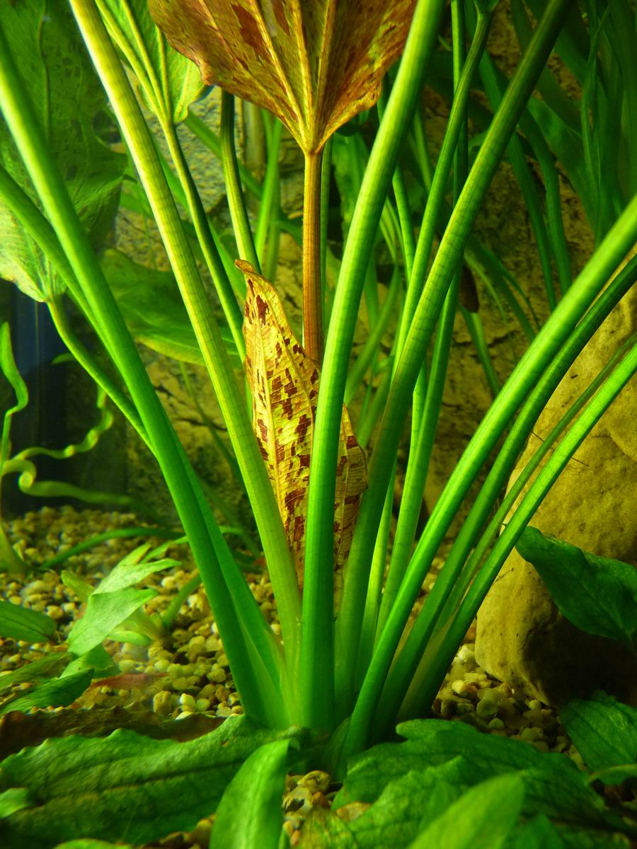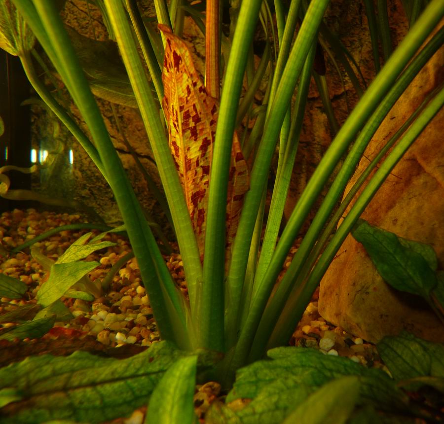 Es ist eine Sorte aus dem Ozelotkomplex (Ozelot, grenn flame, golden flame, red flame), aus dem Bauch heraus würde ich sagen es ist eine E. 'Red Flame'. Die Ausgangssorte 'Ozelot' hat eine kleinere Fleckenstruktur als die anderen. Aber submers sind diese Sorten sehr schwer zu unterscheiden, denn je nach Gegebenheiten und Düngung fallen sie sehr unterschiedlich aus.