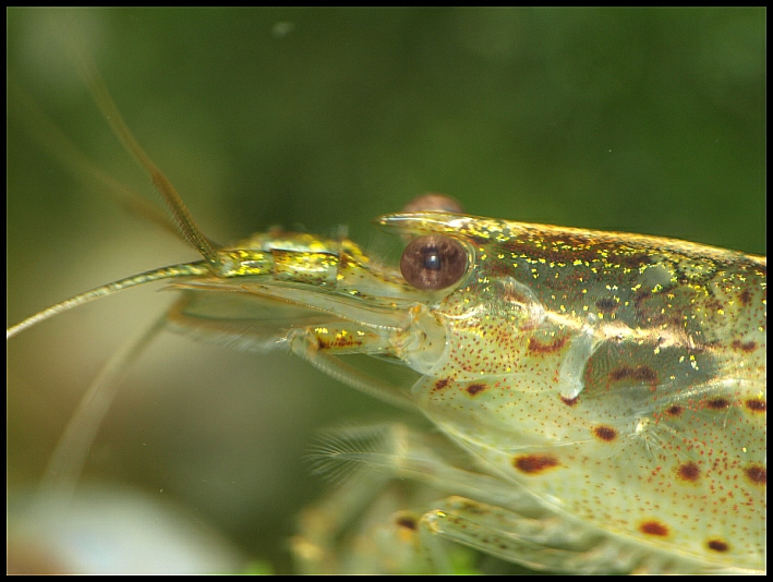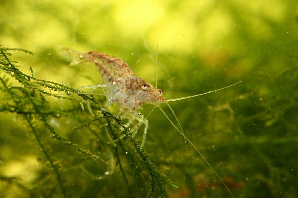 Da fällt mir ein, ich habe doch in einem Javamooszuchtbecken ein paar winzige Garnelen, von denen ich den Namen leider vergessen habe. Die sind ausgewachsen max. 1 cm lang und haben auch immer wieder Nachwuchs. Da habe ich gleich mal die Kamera gewetzt und losgelegt. Vielleicht kennt die ja hier irgendeiner?