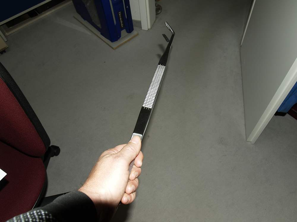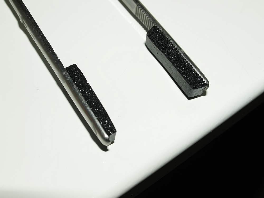 Im Keller hab ich immer ein paar alte undichte Fahrradschläuche für alle möglichen Basteleien und aus so einem hab ich 2 kleine (nahtfreie) Streifen geschnitten und mit Sekundenkleber auf meine "45cm"-Pinzette geklebt.