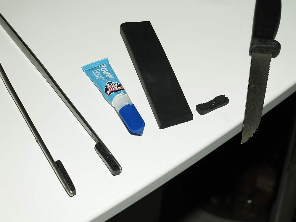 Also hab ich nochmal nachgesehen und ein Stück alten Moosgummi mit glatter Außenhaut gefunden. Den hab ich dann so geschnitten daß nach dem Aufkleben die glatten Seiten beim greifen aufeinander treffen.