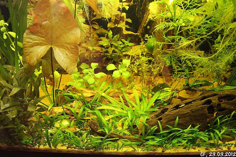 Im Anhang mal ein paar Fotos. Wie ihr seht, ist da nur noch Chaos, die Schwimmpflanzen vermehren sich auch wie die Pest, die fische ich alle 2 Wochen ab und lasse nur noch die großen Mutterpflanzen übrig. Einige Pflanzen fühlen sich in dem Wasser nicht sehr wohl und zersetzen sich immer und immer wieder. Andere, wie der Sumatrafarn, die wachsen und gedeihen.