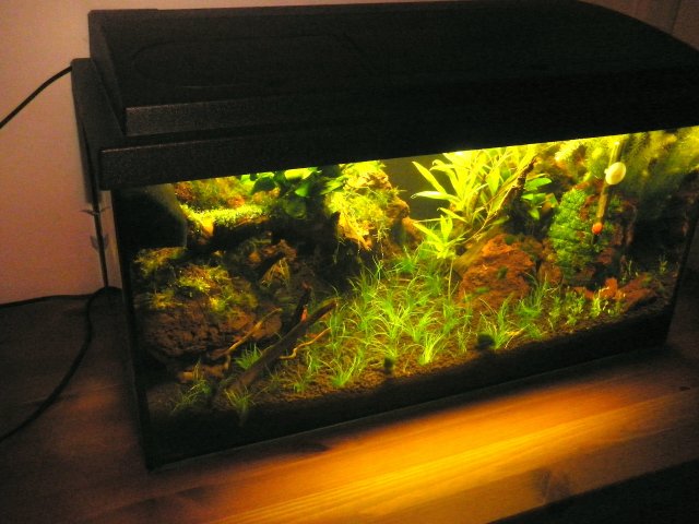 Hallöchen, ich wollte auch mal mein 54 zeigen, das ich vor etwa einem monat aufgemotzt. Ohne CO2 geht hier alles ein bisschen langsamer und die Mayaca Fluviatilis und ich haben so unsere Probleme, im Moment hält sie sich mit sehr viel Eisen doch besser als gedacht, ohne CO2 wird sie aber glaub ich nie so schön rötlich und voll aussehen....