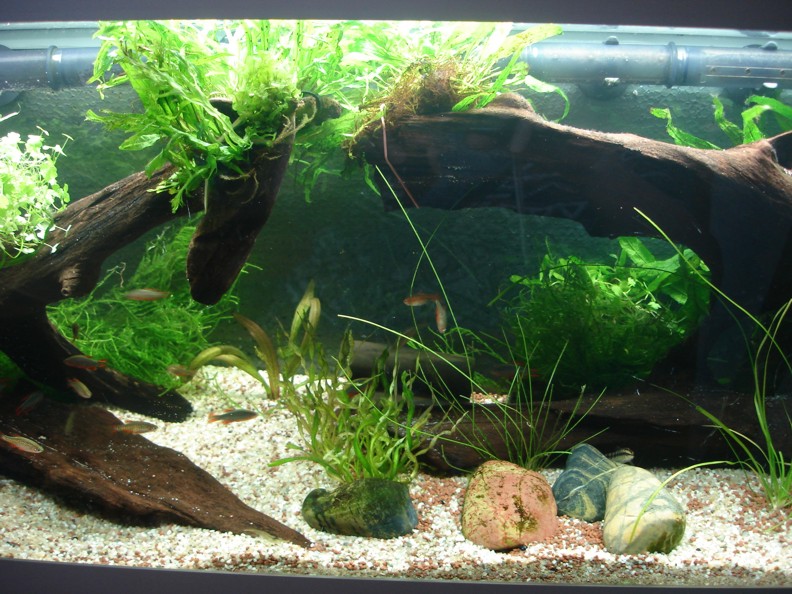 Ebenfalls habe ich heute die Fische aus dem 54 l Becken in dieses Becken gepackt... 11 Mikrorasbora kubutai und 7 Corydoras habrosus... die waren hier ja schonmal drin. Mal sehen was passiert... so mit wenigen Pflanzen gefällt es mir eigentlich auch ganz gut. Mal schauen...
