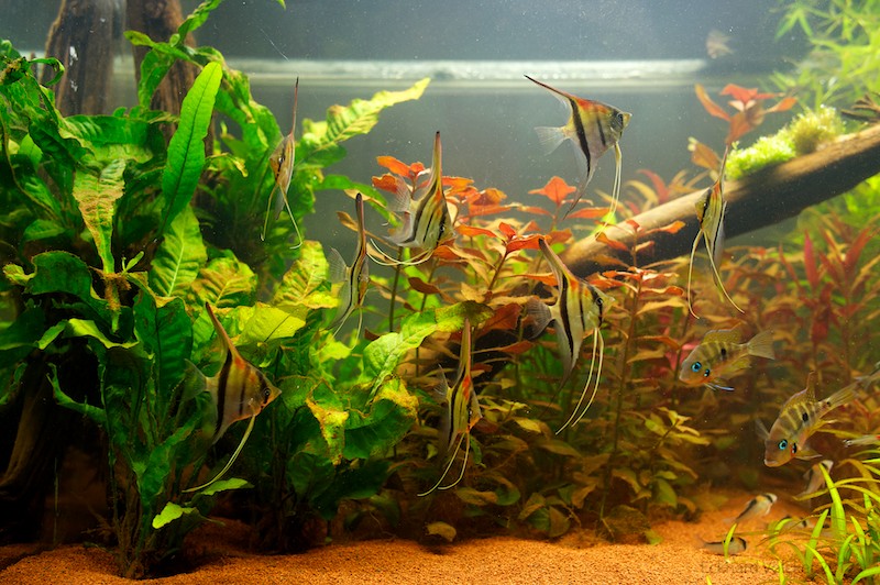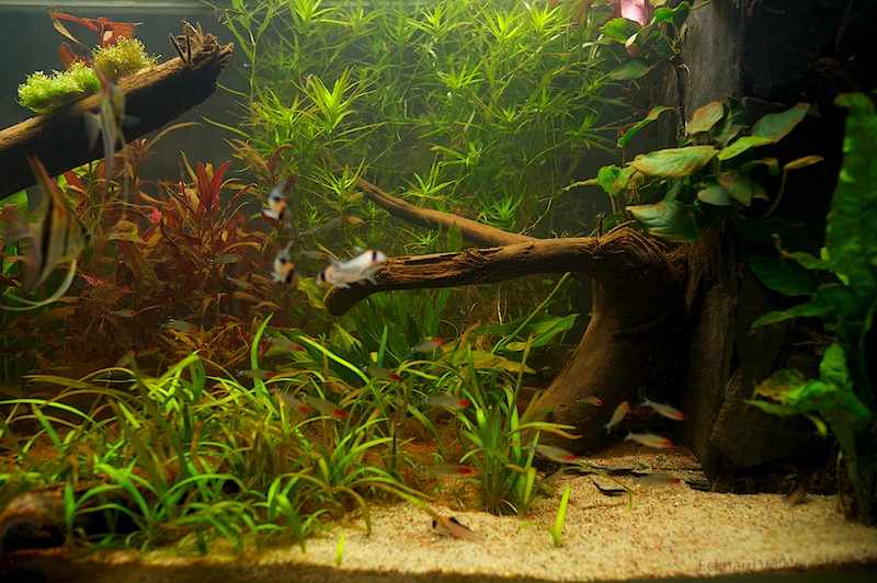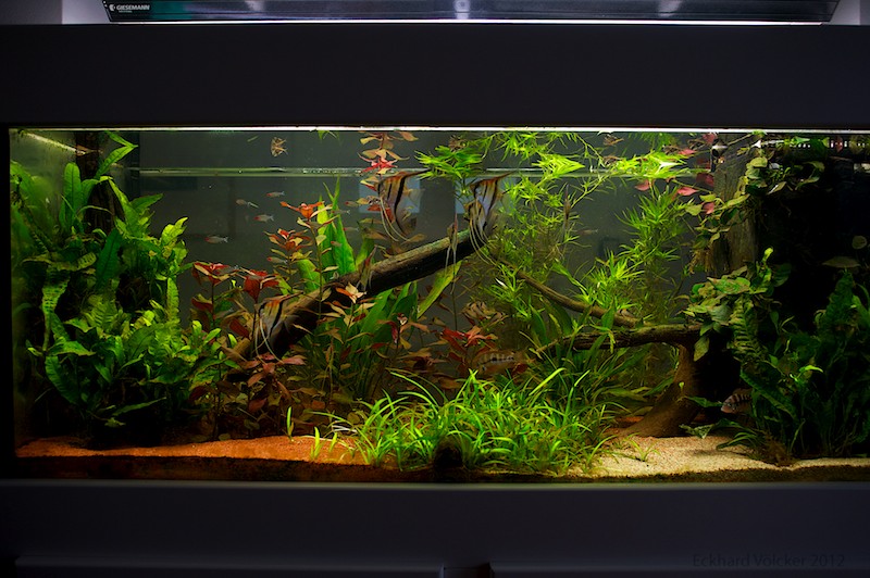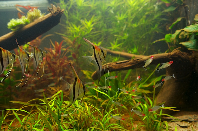 Es sind einige Kieselalgen vorhanden (wie erwartet), dies geht aber schon zurück. Der hohe Phosphat Wert kommt durch die starke Fütterung der Skalare (Jungtiere) mit Frostfutter. Die Fische scheinen sich wohl zu fühlen. Die Rotkopfsalmler haben einen knallroten Kopf bekommen, die Panzerwelse tanzen Abends in Gruppen an der Scheibe und die Elliotis haben schon gelaicht.