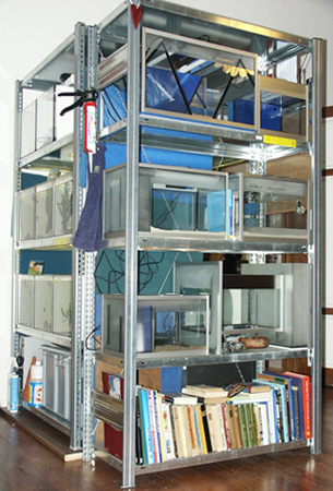 Meine Entscheidung fiel auf einen Regal-Typ (HZG 20510XM) 1000 mm lang x 500 mm tief x 2000 mm hoch, mit 5 Metallböden, Fachlast max. 200 kg, Feldlast max. 1200 kg. Pro Boden 3 Aquarien – Beckengröße: 50 x 30 x 30 Inhalt: 45 Liter. 18 wurden es dann ingesamt. Auf die Metallböden (eine solide gekantete Konstruktion) kam 1 cm Styropor als Unterlage – selbstverständlich mit doppelseitigem Klebeband gegen Verrutschen gesichert. Auf grund der Konstruktion des Regals (50 cm tiefe Böden) stellte ich die Aquarien in ihrer ganzen Tiefe mit ihrer schmalen Seite nebeneinander.