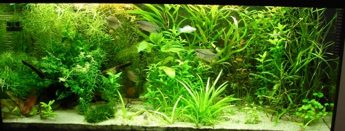Die Bepflanzung ändert sich immer wieder mal ein wenig zur Zeit ist es nicht so super dicht gewachsen aber ich habe dort einige Pflanzen raus gemacht auf Grund von Algenproblemen, die gehen allerdings jetzt wieder zurück.