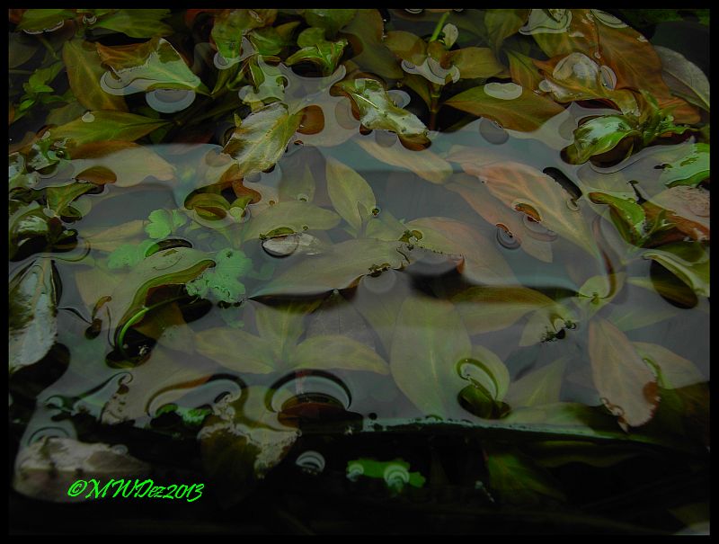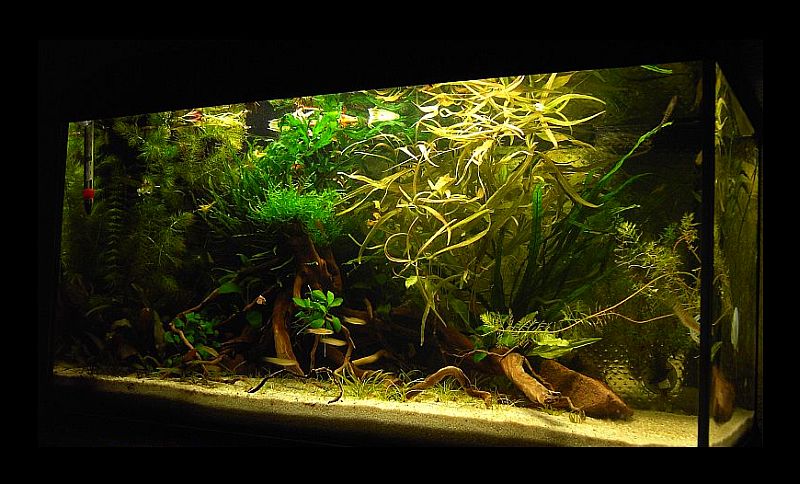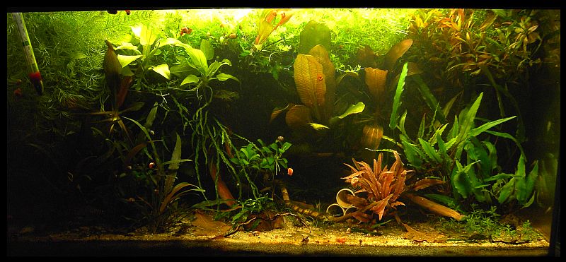 Hier in der Mitte die Pontederifolia, die breitet sich (relativ )ungestüm aus und rechts vor dem Filter, hinter der Bleherie sitzen 2 Aponogeifolia, die sind schon ewig etwa 10cm groß...kriegen alle halbe Jahre mal ein Blatt und das wars...