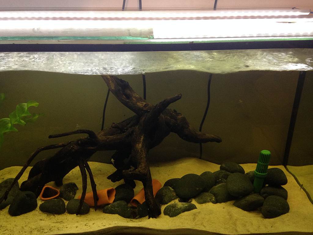 Den Tieren scheint es wohl sehr gut zu gehen. Was beachtenswert ist. Die Tempereatur des Wassers liegt gerade einmal bei 27°C. Also nicht so warm wie man es immer liest. Es wird aber extrem viel Strömung gemacht. Sieht man gut an dem Wellenschlag. An Pflanzen ist fast nichts drinne. Eine Knollenpflanze und das wars. An sonsten noch 4 Tonhöhlen und eine große Wurzel. Bleuchtet wird mit 2 LED Balken die ich im letzten Jahr fertig gemacht habe. Also keine große Anstrengung. Manchmal klappts auch so. Ich glaube das liegt natürlich nur an der TOP Beleuchtung.