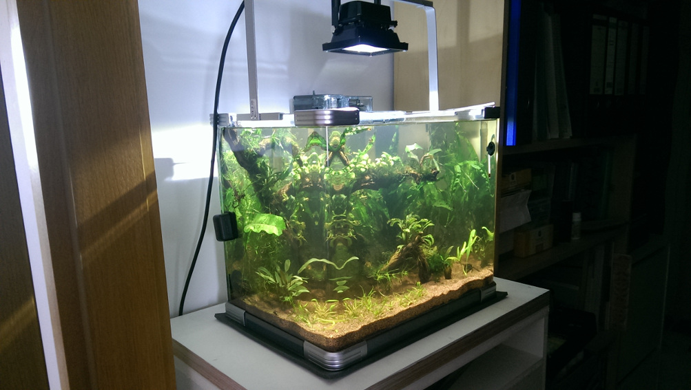 Es ist Arcadia Arc Tank, den ich noch rumstehen hatte. Die Beleuchtung ist ein handelsüblicher LED-Fluter mit 10 Watt/800 Lumen und etwa 6000 Kelvin Farbtemperatur. Die Halterung habe ich selbst aus Alu-Flachstange und u-Profil gebaut, gefiltert wird das Becken mit einem Aquaclear 20 Rucksackfilter.