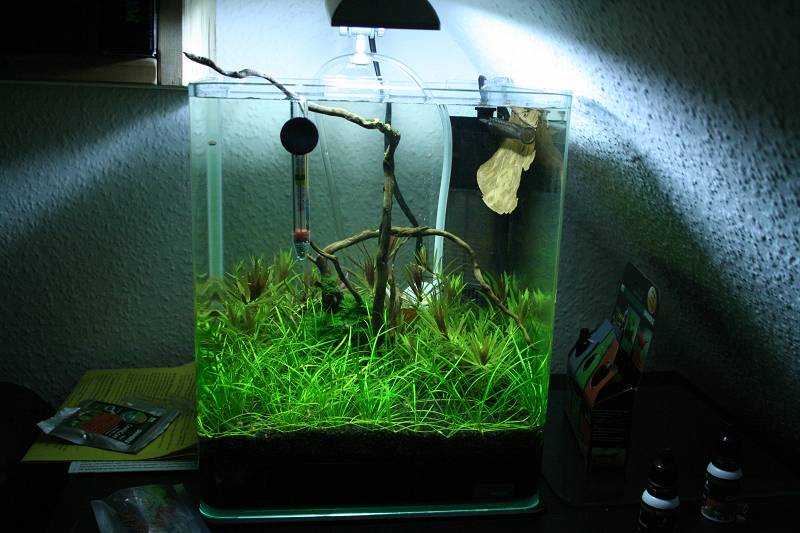 Beleuchtet wird mit den Dennerle Nano Light,11Watt 6000 kelvin .Filter Dennerle Nano Eckfilter bestückt nur mit Filterfließ.Heizung noch keine .Druckgas CO2 Anlage mit 0,5 Kilo Flasche und minni Glas Diffusor Dennerle !