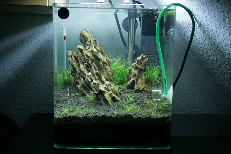Das Moos auf der Wurzel ist Riccardia chamedryfolia (bei Dennerle Korallenmoos genannt)
