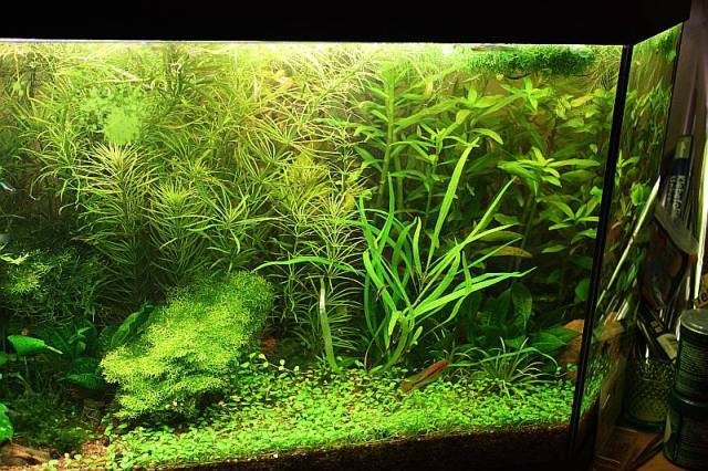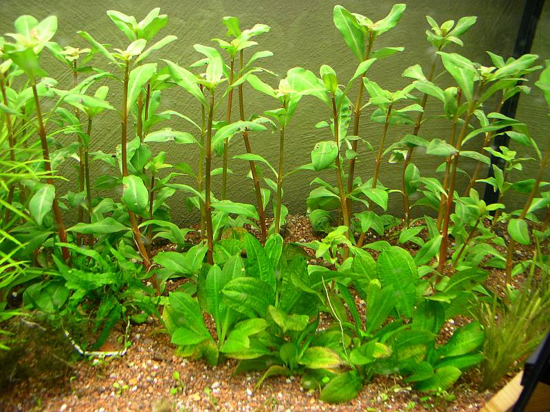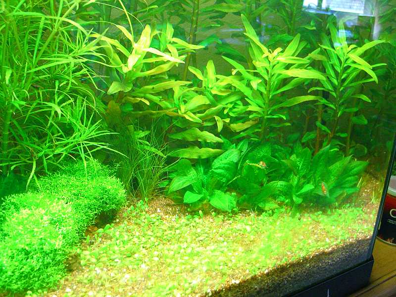 Das Becken war die ganze Zeit mit langsam wachsenden Farnen, Ingo du hast ja welche bekommen, sowie Javamoos und Anudien bepflanzt. Die andere Hälfte war hauptsächlich mit Echis zugestopft. Druch die ganzen Pflanzen war kaum noch ein Fisch oder eine Garnele zu sehen. Als ich dann Pflanzen für den Raum bestellt habe, dacht ich mir ich könne doch gleich Porto sparen und die geplanten Pflanzen für dieses Becken gleich mitbestellen. So hatte ich dann dieses Wochenende richtig was zu tun. :lol: