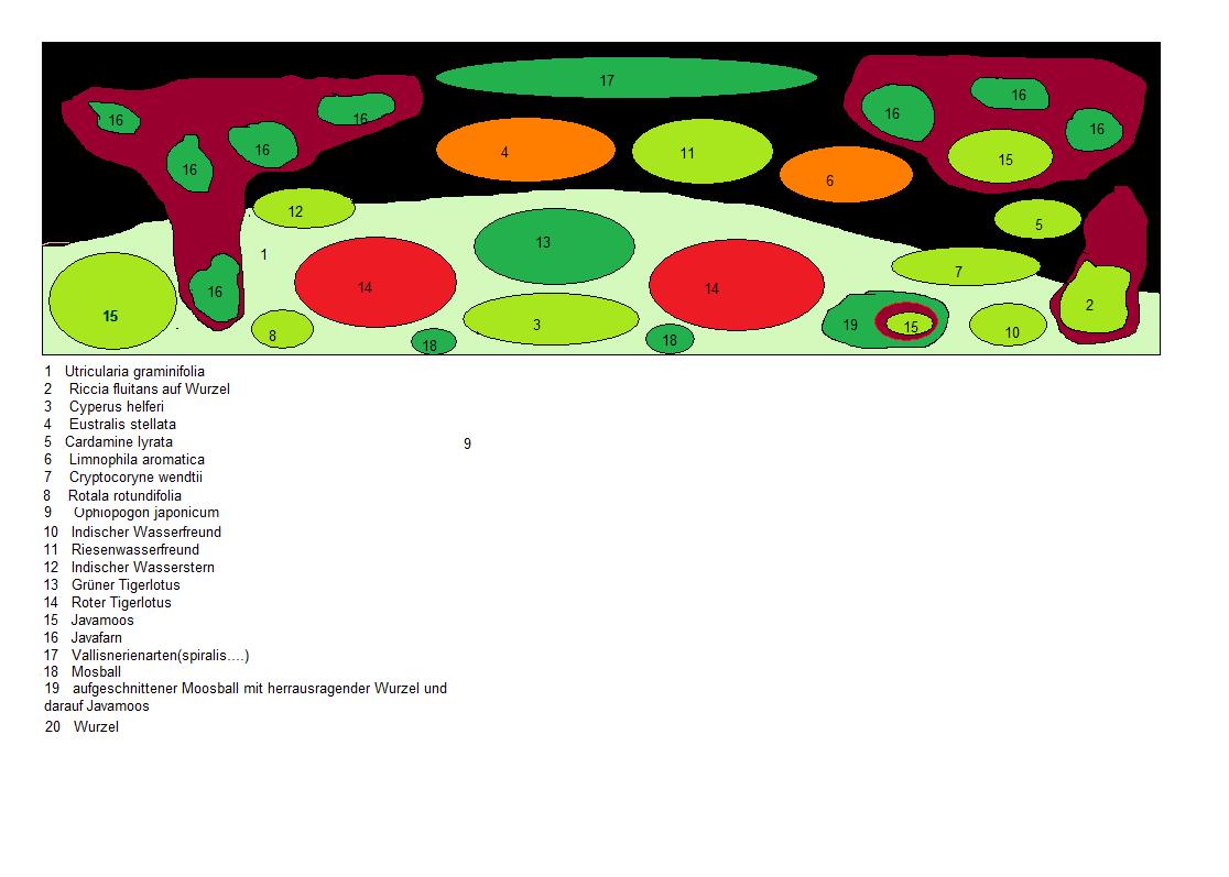 Ich habe mal einen Pflanzplan erstellt. Könnt ihr euch den bitte mal anschauen und sagen, ob das so passen würde? Ich bin mir nicht sicher, ob Cyperus helferi wirklich nach vorne kann, da es angeblich ja bis 50cm hoch werden kann?! Eventuell lieber den vorderen Platz mit der wendtii tauschen?
